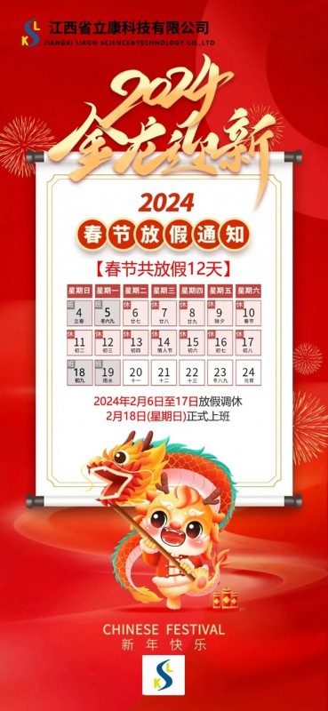 尊敬的各位新老客戶(hù)們、親愛(ài)的伙伴朋友們:年終歲尾,我們將和2023年揮手說(shuō)再見(jiàn),即將迎來(lái)的是一個(gè)充滿吉祥寓意的2024年——龍年。我們懷著感激之情,向您致以最衷心的祝福。感謝您在過(guò)去的一年里對(duì)我們的信任與支持,正是有了您的支持,我們才能取得今天的成績(jī)。春節(jié)期間,結(jié)合我司實(shí)際情況及國(guó)家法定假期安排進(jìn)行